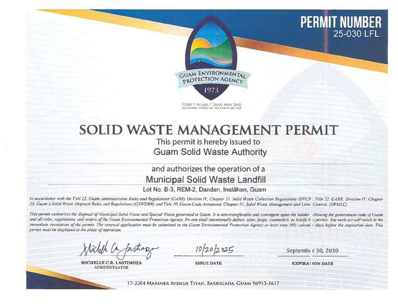 The Layon Landfill is owned by the Guam Solid Waste Authority and operated by Herzog Environmental, Inc.